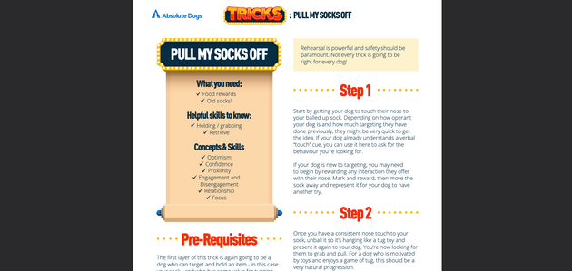 This programme is ideal for any dog owner looking to dive into the wonderful world of trick training, whether you’re just starting out or you’re already trick masters in the making! Tricks range in difficulty level - some are perfect for beginners while others will take a little longer to perfect and require a few more foundational skills first.